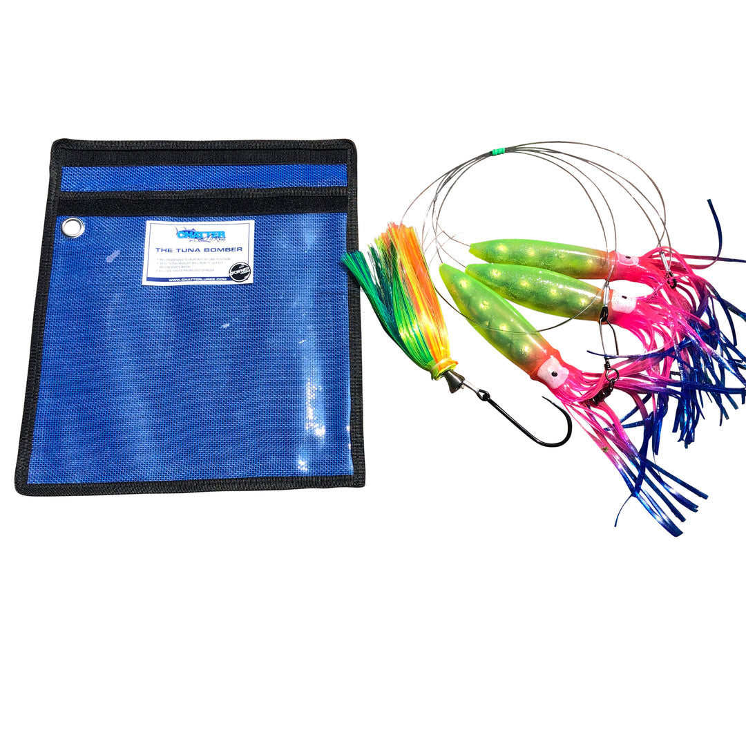"THE TUNA BOMBER" - ChatterLures has created a truly one-of-a-kind custom daisy chain designed specifically for trolling up monster Bigeye tuna! The Tuna Bomber, new from ChatterLures, blends some of the most effective methods for targeting large specimens - utilizing 3 oversized 11” bulb squids each loaded with a 10 oz. egg sinker, and paired with a pin rigged 8oz Joe Shute / 9/0 Owner Jobu Trolling Hook at the business end (removable).
